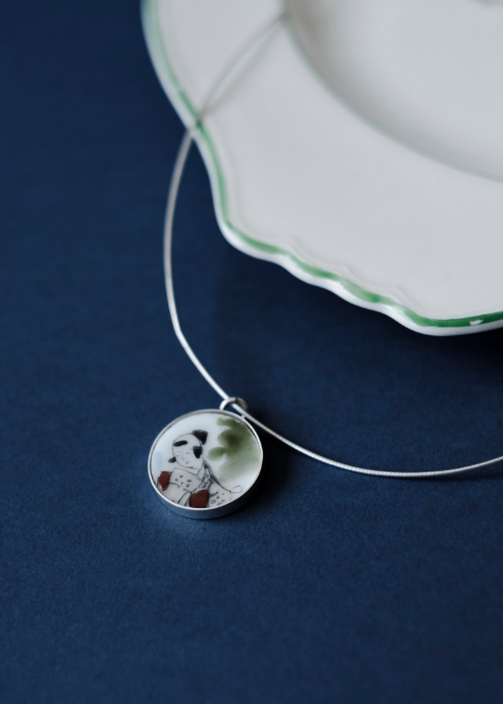 Voulant ajouter de la couleur à mes premières expérimentations en joaillerie, soit le support à cabochon, je me suis intéressée à des matières autres que les traditionnelles pierres pour en garnir la forme. En fréquentant les brocantes de ma région, je suis tombée sur une pile d’assiettes disparates en faïence qui offraient de petites scénettes romantiques et de délicats dessins.